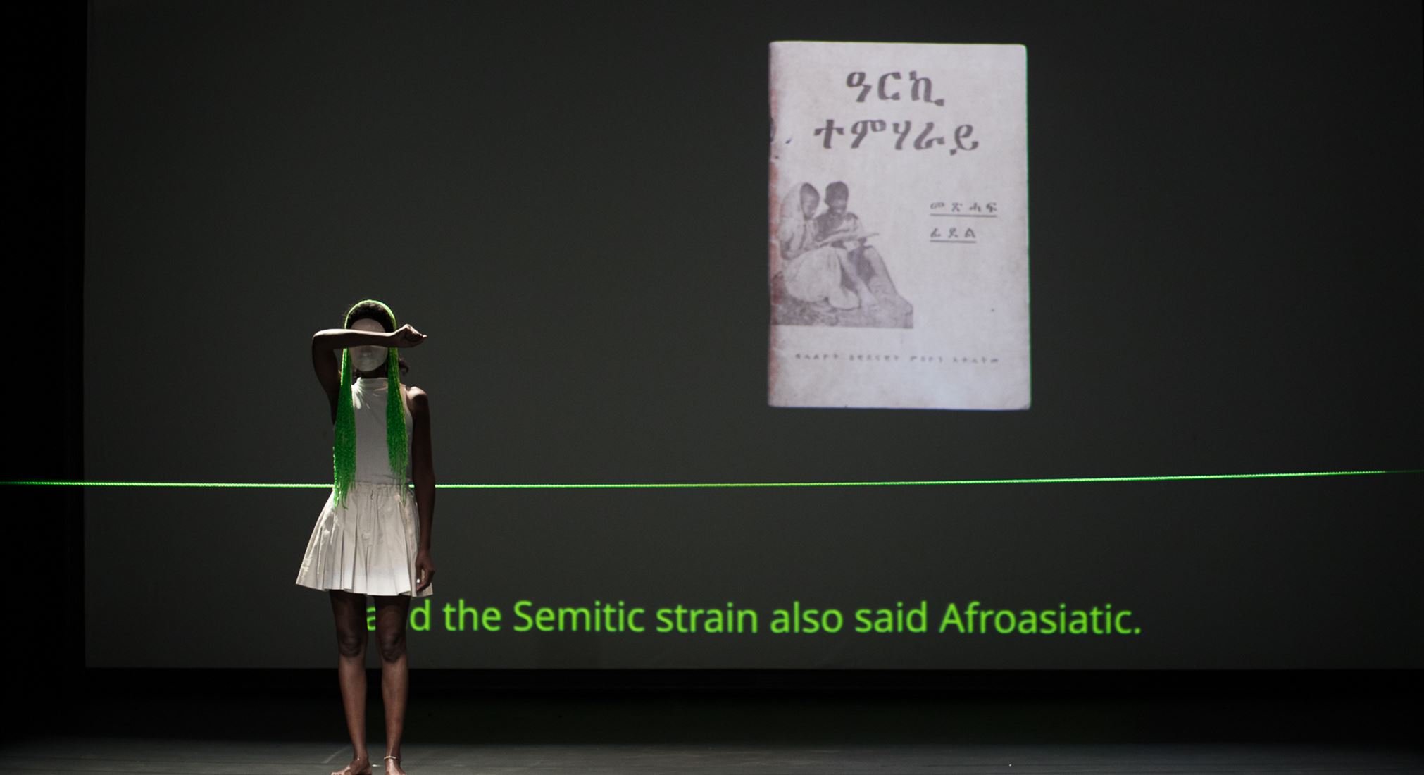 In CURVA CIECA arbeitet Muna Mussie mit Filmon Yemane zusammen, einem jungen Mann aus Eritrea, der derzeit in Bologna lebt und seit seinem zwölften Lebensjahr blind ist. In der Performance geht es um die Erforschung von Munas Muttersprache Tigrinya mittels eines Dialogs aus Worten, Zeichen und Bedeutungsänderungen. Angeleitet von Filmons Stimme hören wir Tigrinya-Lektionen, die mit Darstellungen aus einem alten Buchstabenbuch visualisiert werden. Der Körper der Künstlerin überschneidet sich mit den gewundenen Linien des Alphabets und suggeriert eine dynamische Mimesis. CURVA CIECA ist ein metapädagogisches Instrument, das durch ein didaktisches Format einen intimen Rahmen schafft, in dem eine biografische Erzählung zu philosophischen Überlegungen anregt.