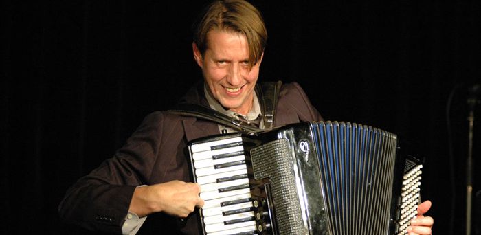 Dabei sitzt er doch ganz entspannt auf der Bühne, spielt mal Akkordeon und mal Klavier, aber dazwischen lädt er auch schon mal die Pumpgun durch.